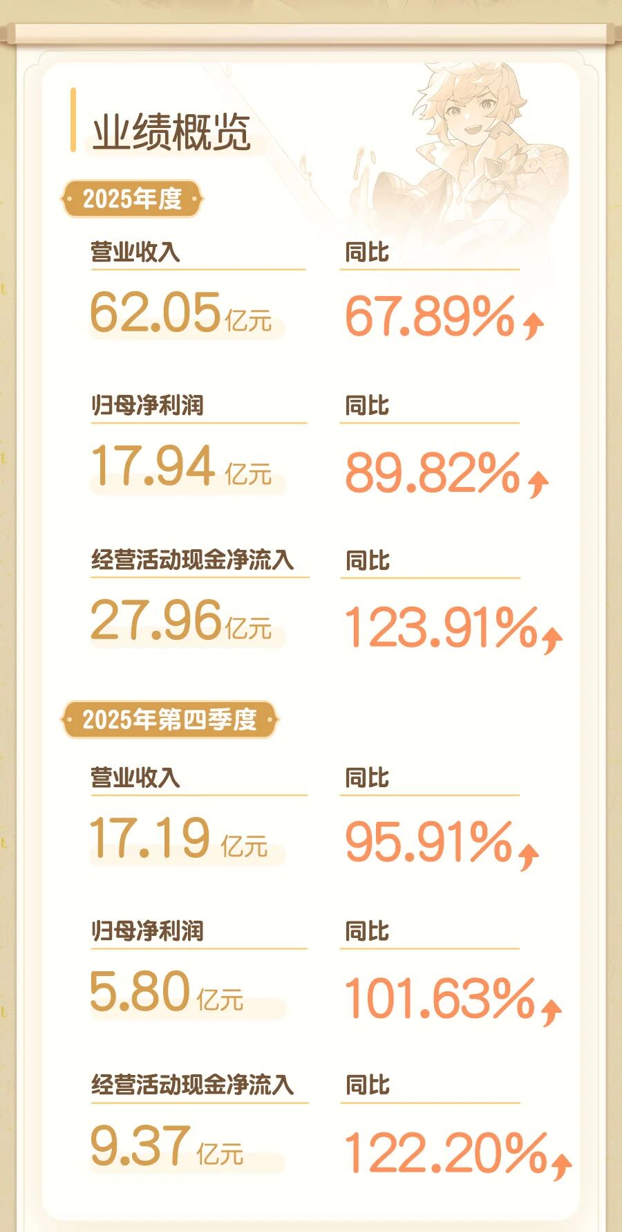 DoNews3月26日消息,3月27日,吉比特(603444)發(fā)布2025年年報,公司實現(xiàn)營業(yè)總收入62.05億元,同比增長67.89%,歸母凈利潤17.94億,同比增長89.82%。